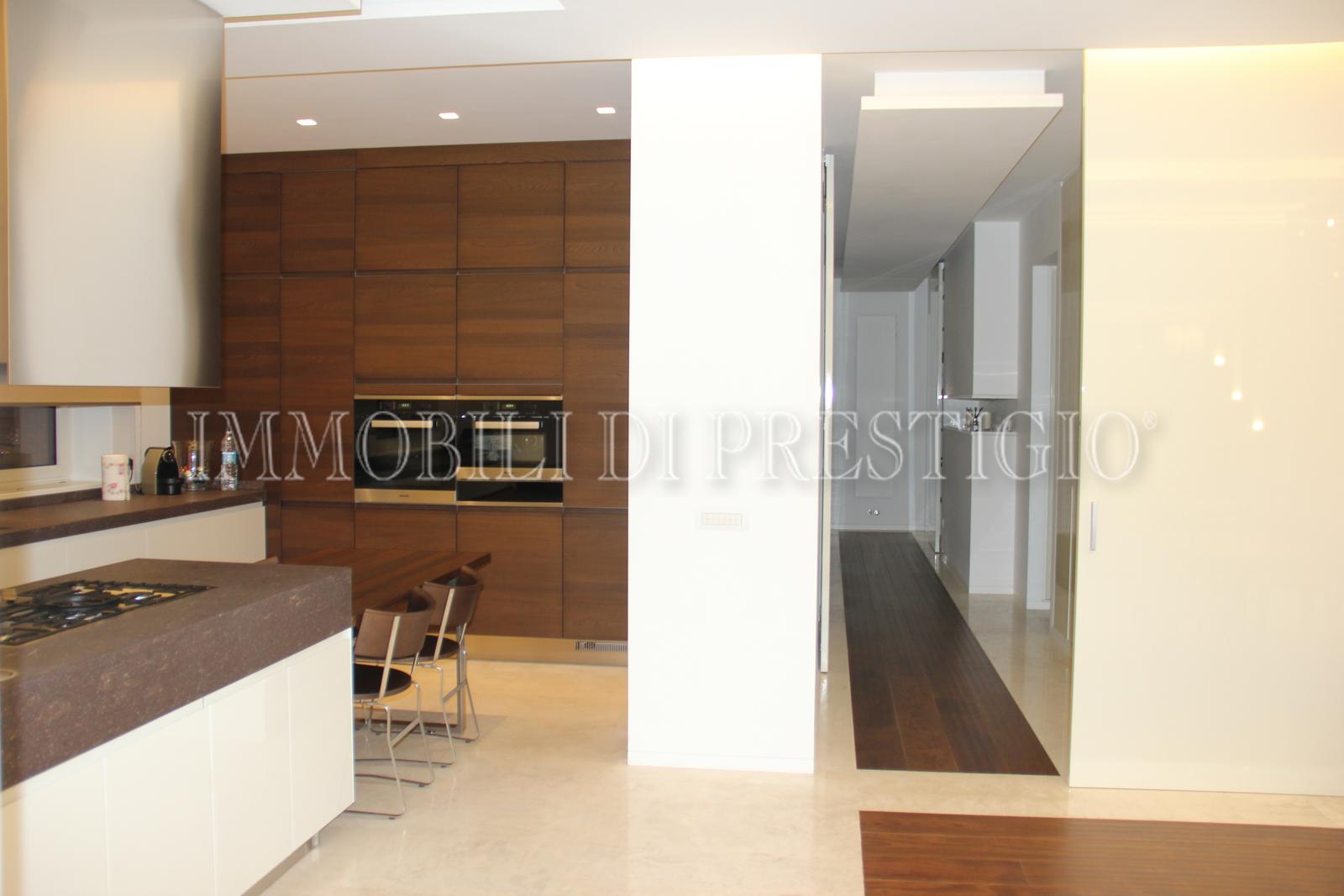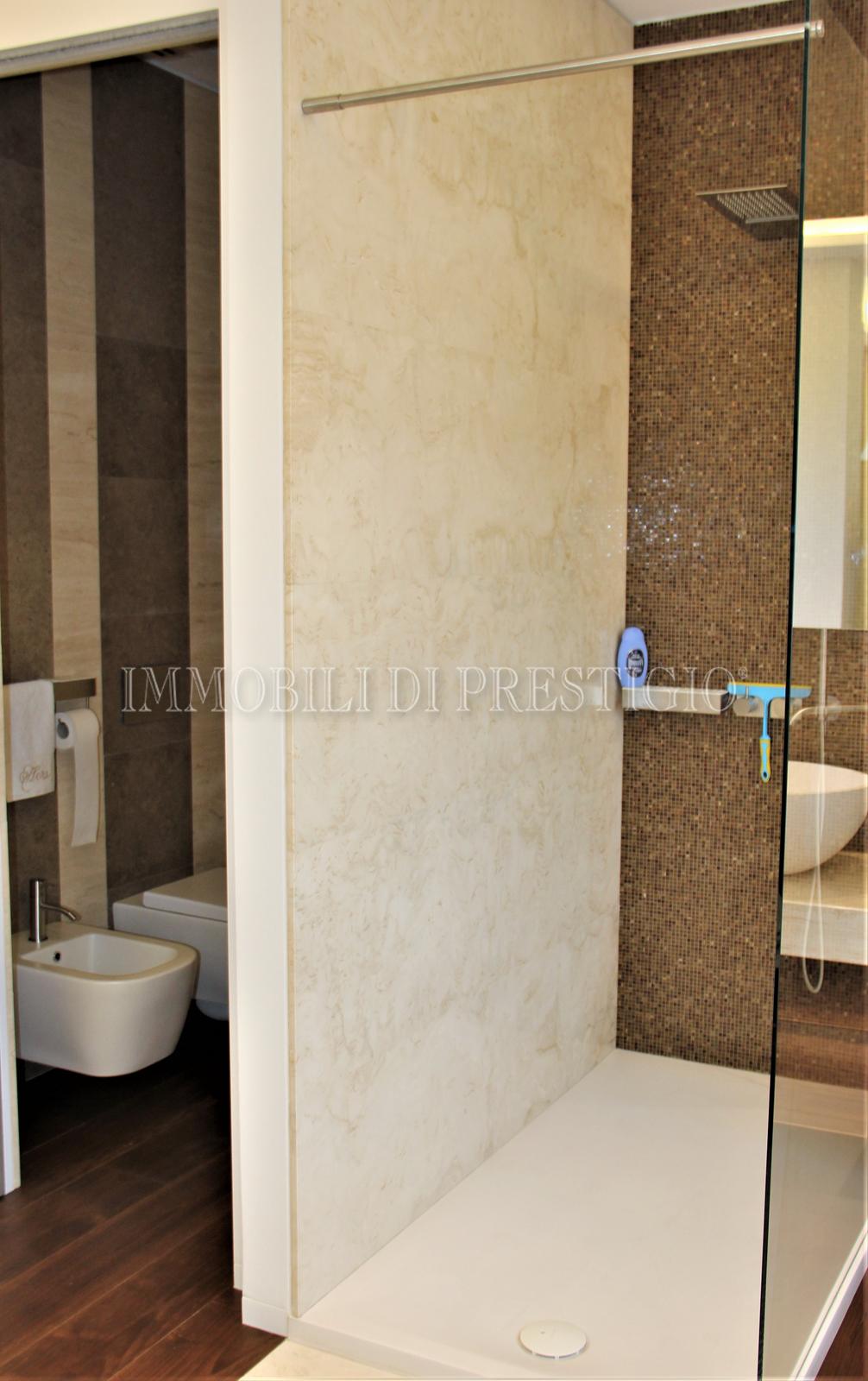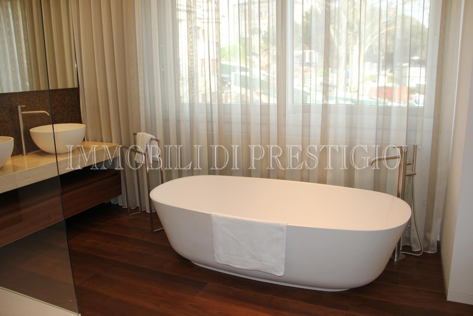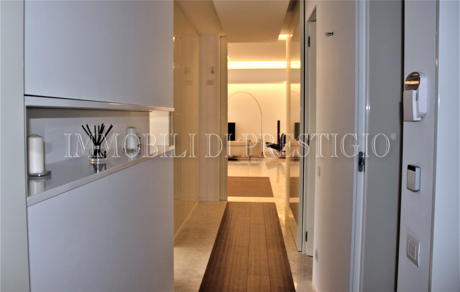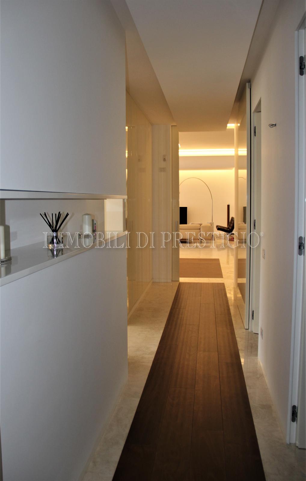 A long corridor embellished with modern boiserie and cupboard to measure, places in the sleeping area consisting of the three double bedrooms with en suite bathrooms, of which the master with exposed bath, shower and wardrobe, service room, with laundry / ironing; From the sleeping area you can access the large panoramic loggia and a long balcony facing the area.