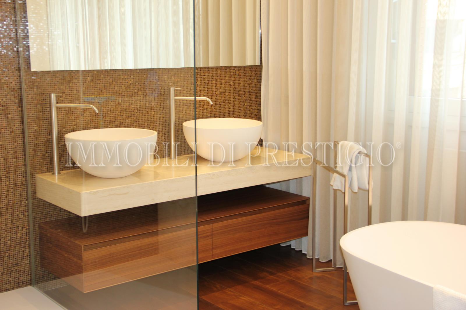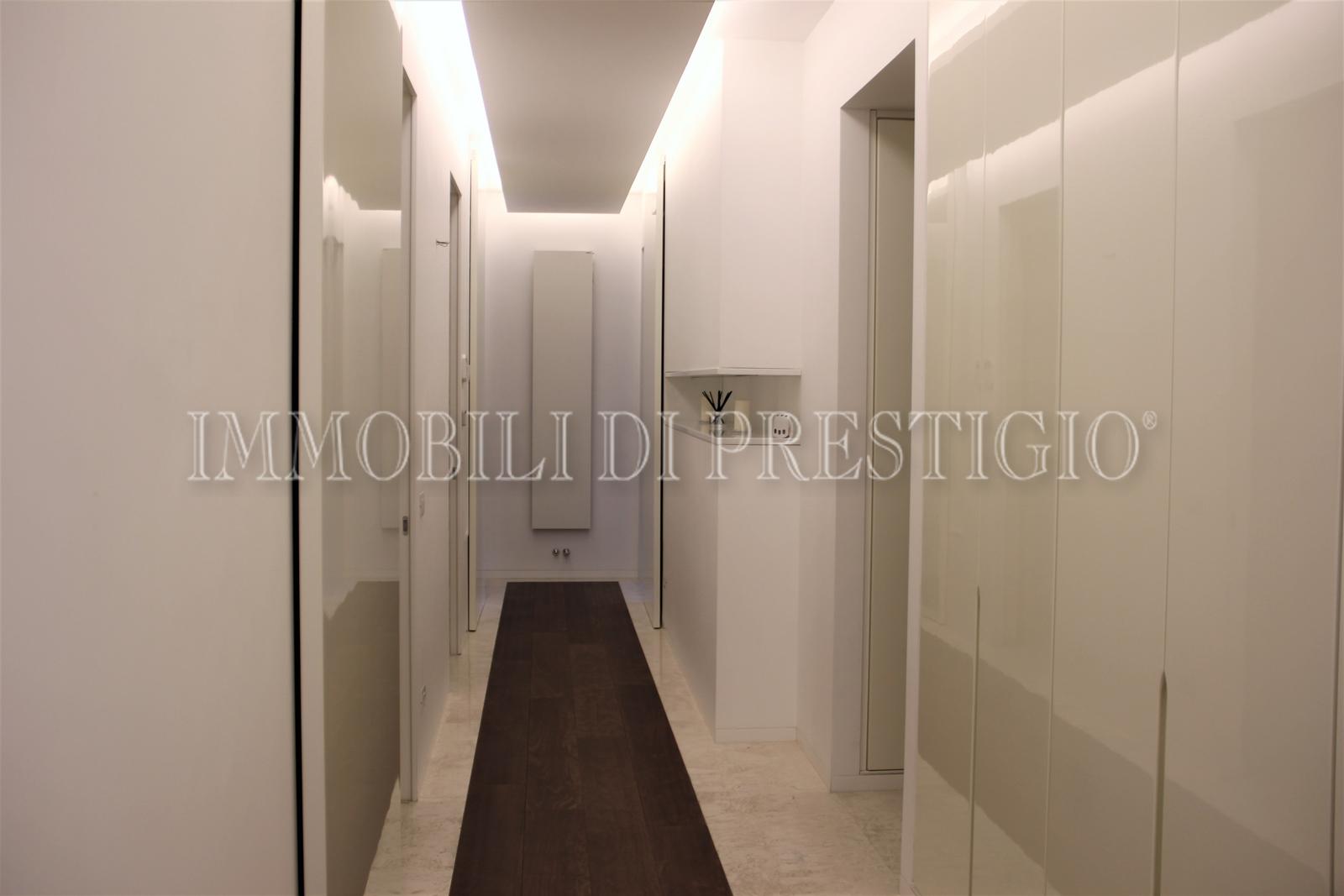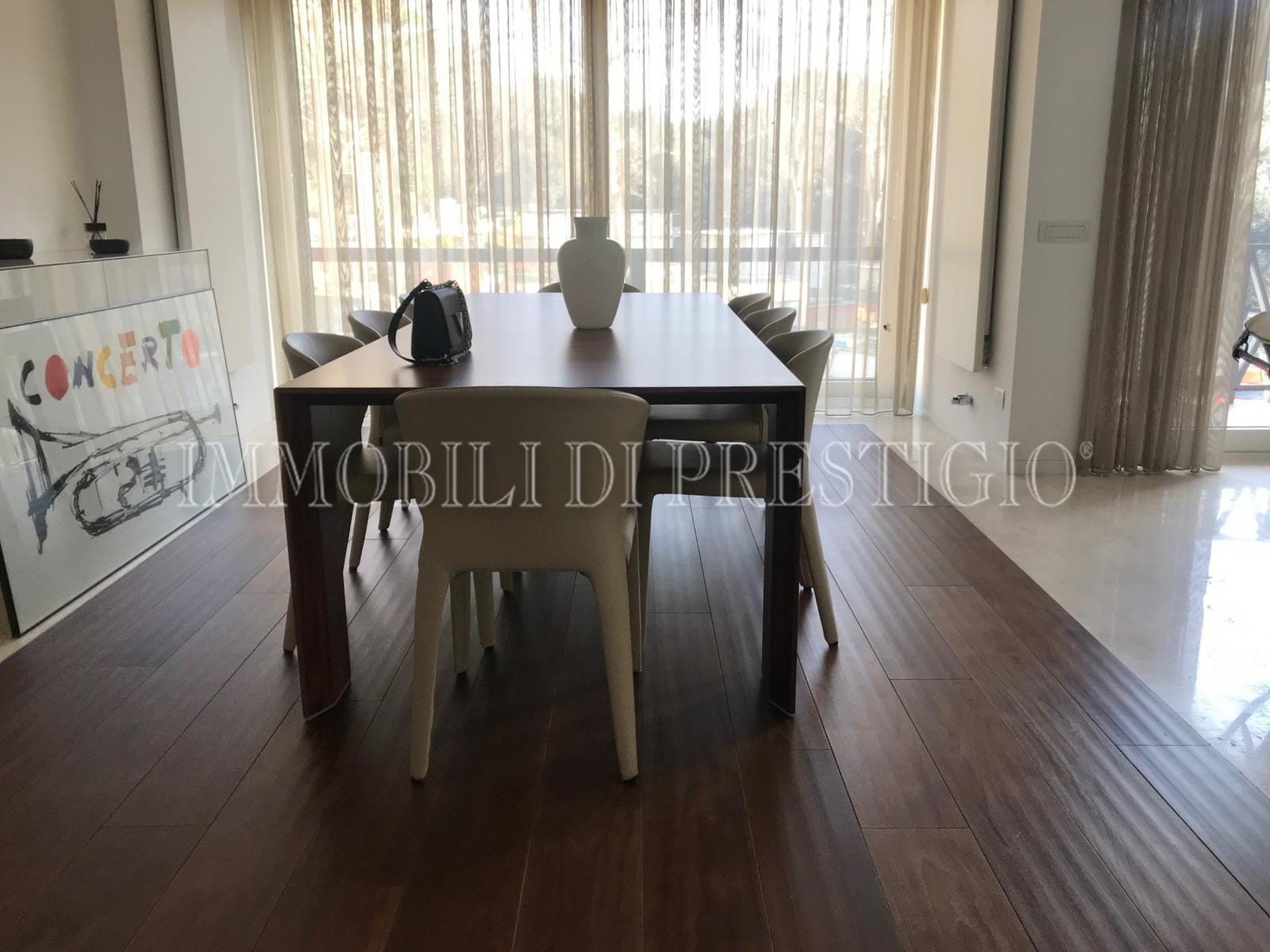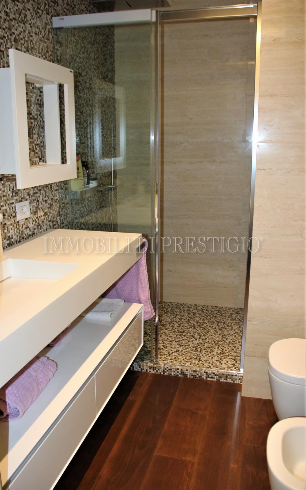 A long corridor embellished with modern boiserie and cupboard to measure, places in the sleeping area consisting of the three double bedrooms with en suite bathrooms, of which the master with exposed bath, shower and wardrobe, service room, with laundry / ironing; From the sleeping area you can access the large panoramic loggia and a long balcony facing the area.