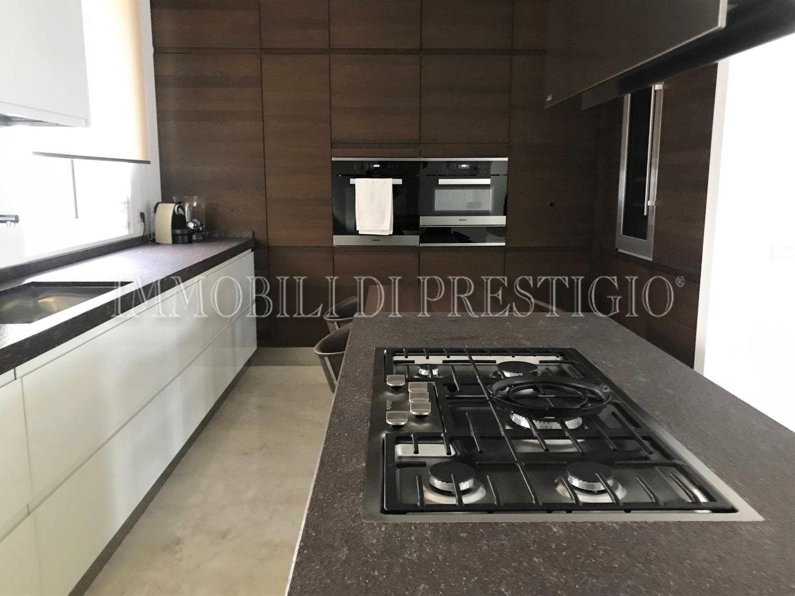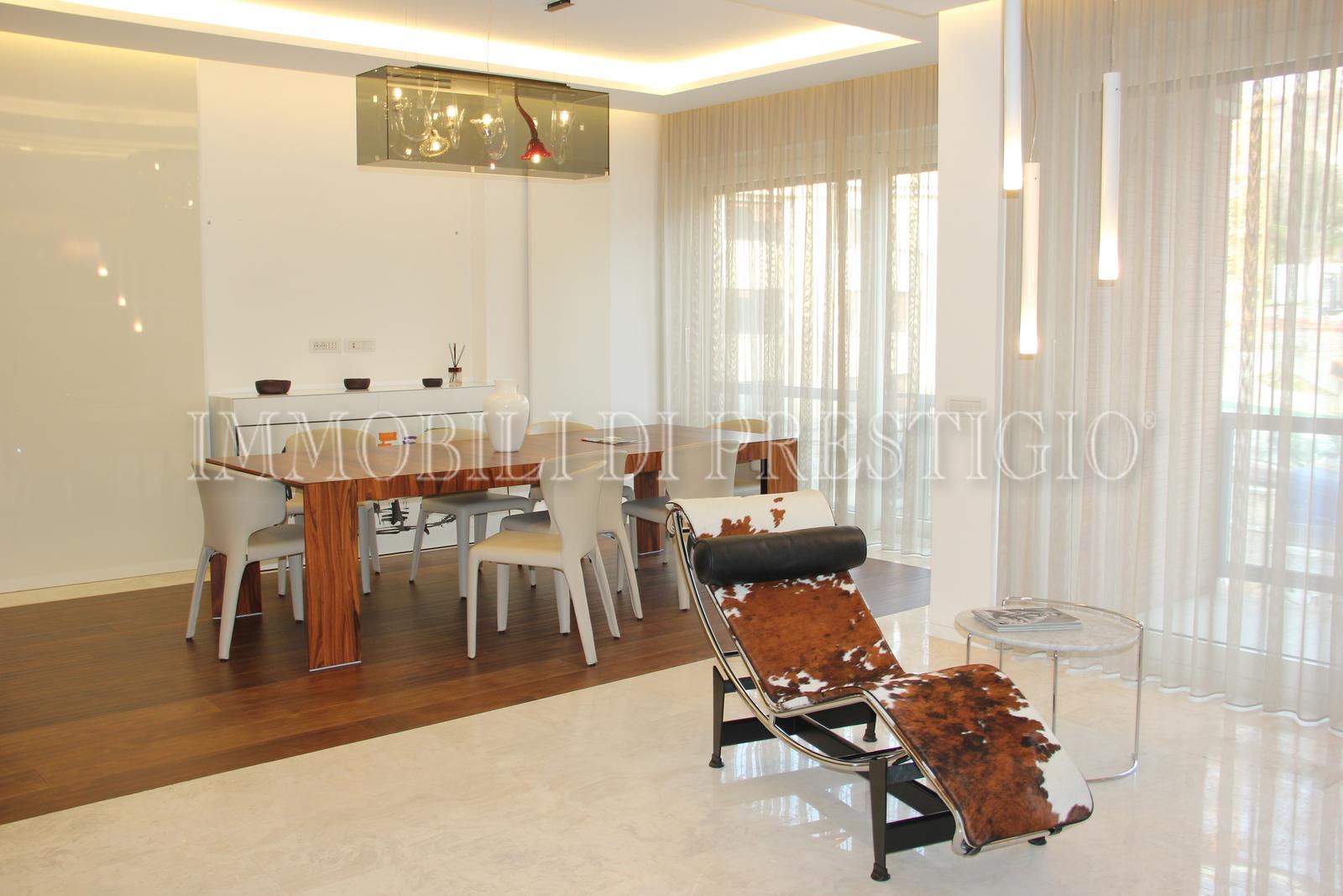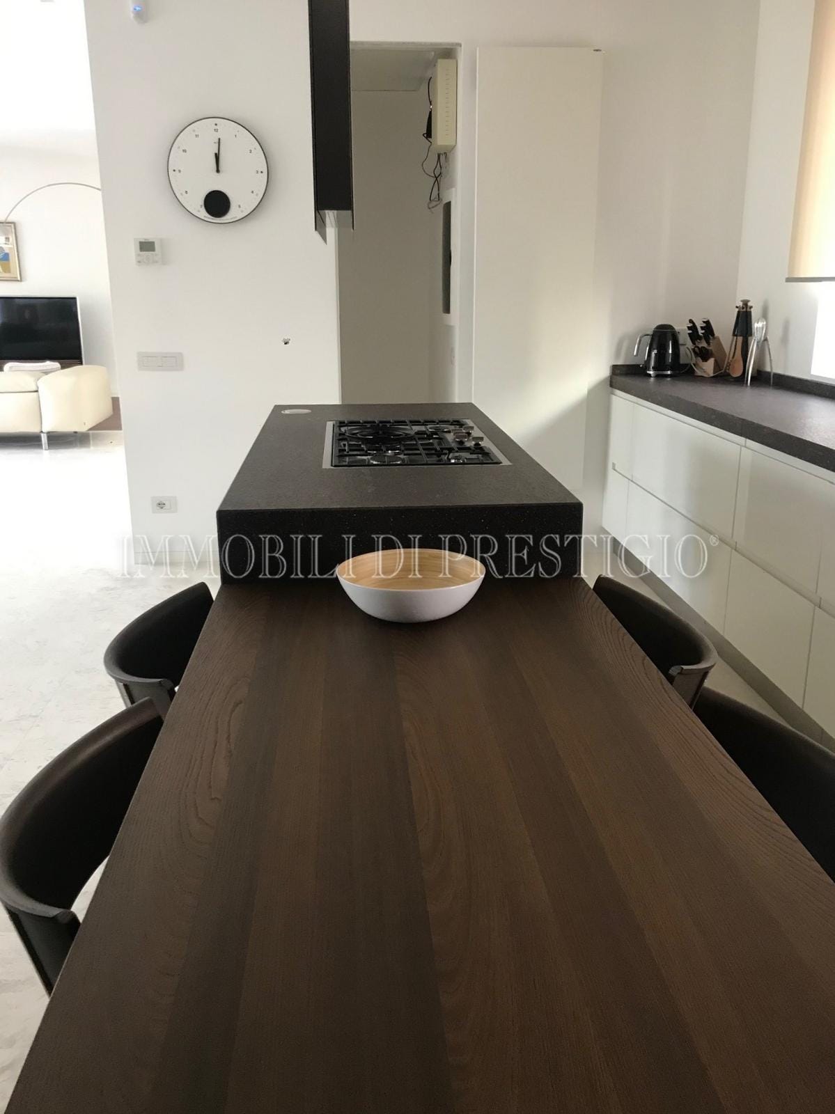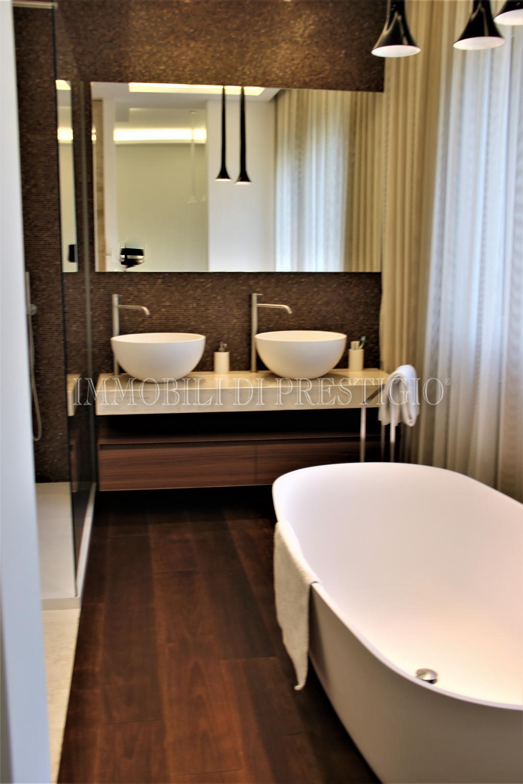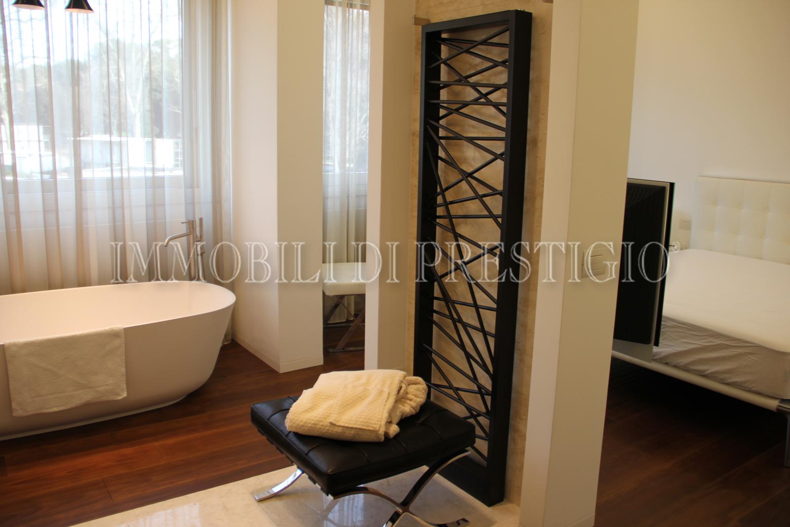 A long corridor embellished with modern boiserie and cupboard to measure, places in the sleeping area consisting of the three double bedrooms with en suite bathrooms, of which the master with exposed bath, shower and wardrobe, service room, with laundry / ironing; From the sleeping area you can access the large panoramic loggia and a long balcony facing the area.
