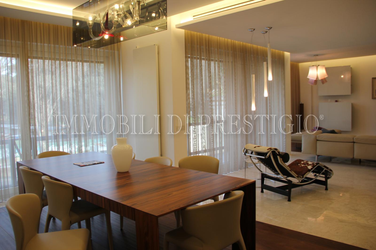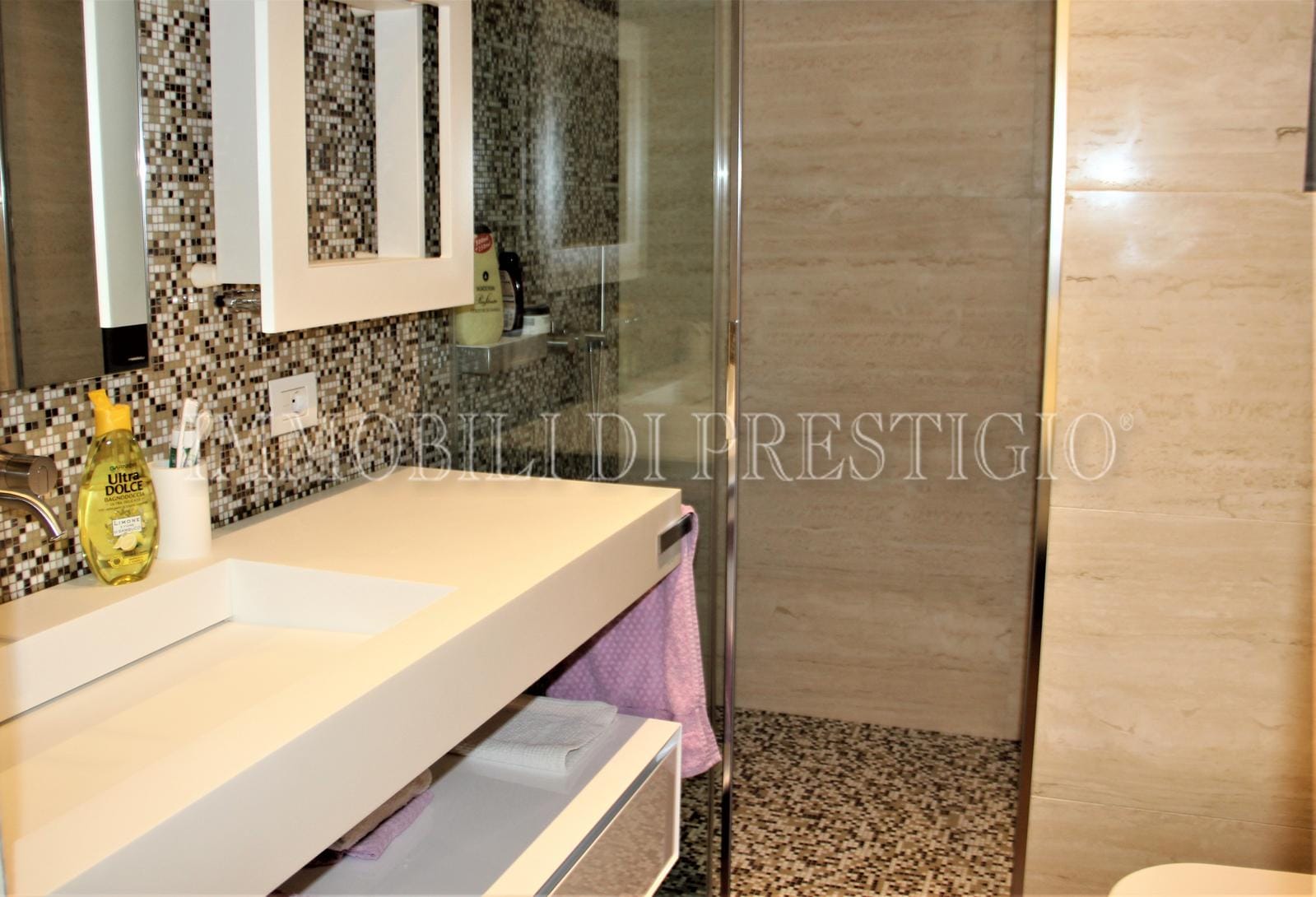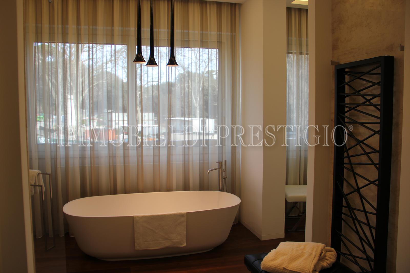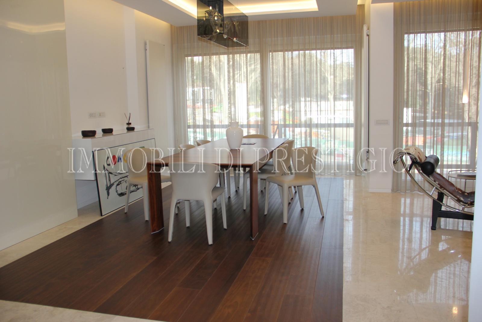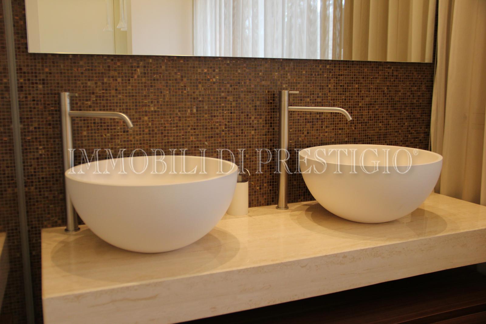 A long corridor embellished with modern boiserie and cupboard to measure, places in the sleeping area consisting of the three double bedrooms with en suite bathrooms, of which the master with exposed bath, shower and wardrobe, service room, with laundry / ironing; From the sleeping area you can access the large panoramic loggia and a long balcony facing the area.